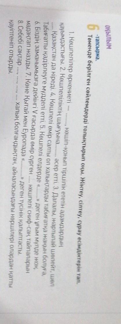 ОҚЫЛЫМ -тапсырма. 6 Төменде берілген сөйлемдерді толықтырып оқы. Жіктеу, сілтеу, сұрау есімдіктерін тап. 44) 1. Көшпелілер өркениеті — ... көшіп-қонып тіршілік ететін адамдардың қауымдастығы. 2. Көшпеліліктің шығуына әсер етті. 3. Далалы, жартылай шөлейт, шөл Қазақстан да кіреді. 4. Көшпелі өмір салты ол халықтарды табиғатқа жақын болуға, Табиғатты қадірлеуге мүдделі етті. 5. Көшпелі елдерде «» деген ұғым мүлде жоқ. 6. Біздің заманымызға дейінгі V ғасырда өмір сүрген көшпелі скиф-сақ тайпаларын мадақтап жазды. 7. Көне Қытай мен Еуропада «» деген түсінік қалыптасты. 8. Себебі сақтар , халық болғандықтан, айналасындағы көршілері олардан қатты қауіптеніп отырды. * *