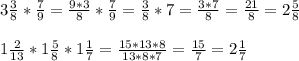 1) 27/8 * 7/9=(27 * 7)/(8 * 9)=3*7/8=21/8=2 5/8