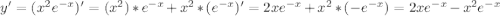 y'=2xe^(-x)-e^(-x)*x^2=xe^(-x)(2-x)