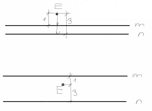 Даны параллельные прямые m и n .точка е удалена на прямой m на расстоянии 1 см ,а от прямой n на расстоянии 3 см .на каком расстоянии друг от друга находятся параллельные прямые m и n ? сколько решений имеет .