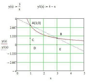 Площадь фигуры AB (ограниченная двумя линиями) считаем как Sab=Sabde-Sabc, здесь Sabc=интеграл от 1 до 3 (3/x)dx=3,296 кв. единиц (от красной сплошной линии). S abde=Scbde+Sabc (от пунктирной линии). Scbde=1*2=2 кв. единицы (пл-дь прямоугольника) Sabc=2*2/2=2 кв. единицы (пл-дь треугольника). Sabde=2+2=4 в. единицы. Sab=4-3,296= 0,704 кв. единицы.